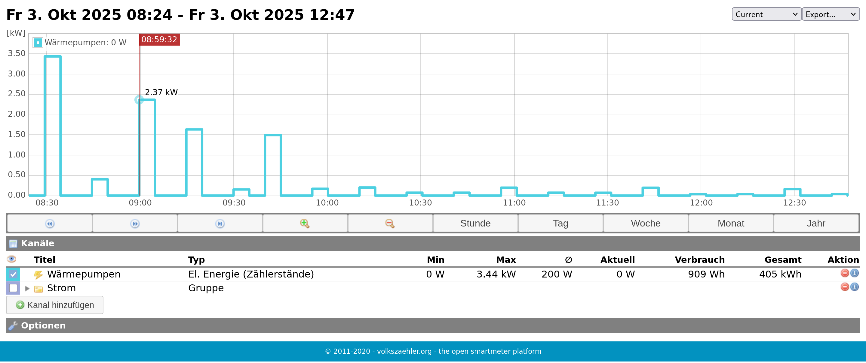 Die Zählerdaten wollte ich lokal abrufen und in meine Volkszähler-Instanz einspeisen - dort landen auch schon die Daten des Hausstromzählers, der schaltbaren Steckdosen und der Waschmaschine.